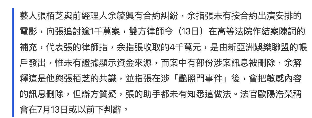 张柏芝与前经理人(经纪人)余毓兴的合约纠纷,在2025年12月正式开庭审理,期间张柏芝罕见三度现身法庭作供,在庭上表现颇为激动,几度激动落泪。除了张柏芝之外,张柏芝的现任助手Emily,以及原告等相关人士都有现身法庭作供。在审理结束后,法官当时宣布在2026年1月13日作结案陈词,如今在结案陈词之后,法官仍然没有下最后判决,只是表示会在半年内,也就是在7月13日或是之前做最后的判决。