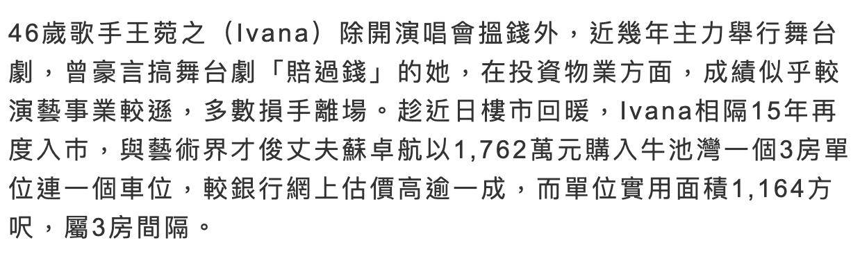 香港楼市回暖,有不少香港名人斥资买房投资,现年46岁的香港歌手王菀之也成为了其中的一员。王菀之出道多年,以专注音乐发展为主,近些年又四处举办演唱会,搞舞台剧,也赚了不少钱,足以在香港买房。早前她低调在香港以1762万买入牛池湾的一个单位,连同一个车位,房子的价格在香港一众豪宅中不算特别高,但是这个买入价已经比银行在网上的估价要高了一成。