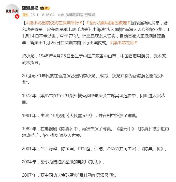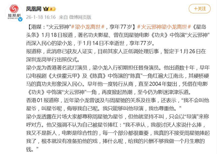 据1月18日报道,1月14日,香港功夫巨星梁小龙在深圳逝世的消息,让无数影迷惊愕不已。这位以“火云邪神”和“陈真”两个角色刻入几代人记忆的硬汉,享年77岁