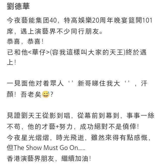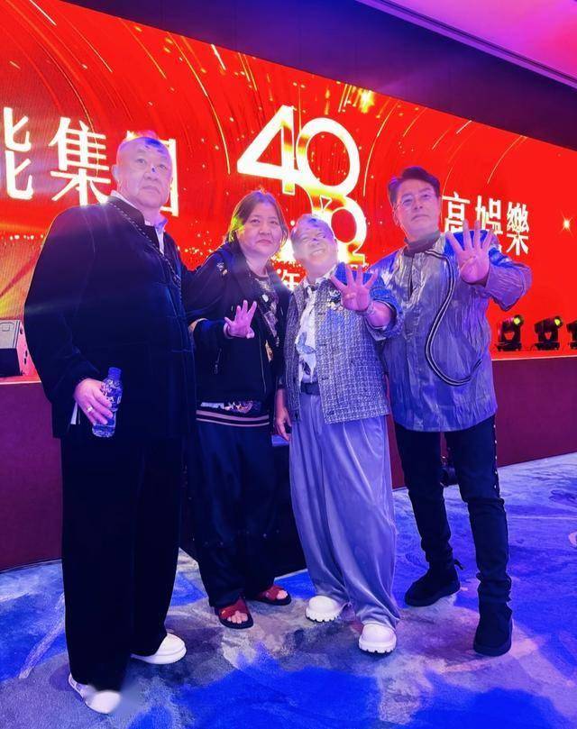 来看该嘉宾晒出的照片。这张大合照里,左一、二分别是谭咏麟、刘德华;右一和右五是黄日华、曾志伟。