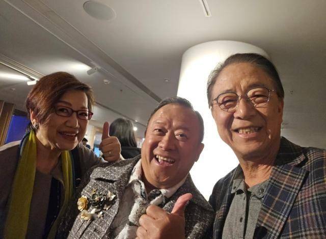有一张是嘉宾夫妇和曾志伟的合影。曾志伟头发花白且稀少,一身打扮时尚。他笑容灿烂,一只手竖起了大拇指。