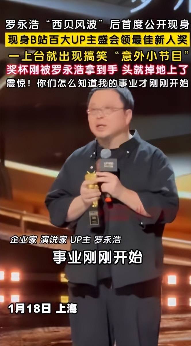 1月18日晚的B站百大UP主颁奖典礼,成为罗永浩微博被禁言后的首次公开亮相。他与于谦同台,原本被提名的“终身成就奖”遭二人现场明确拒绝,罗永浩调侃道“我们都哈哈严词拒绝了”,并解释核心原因:“因为我们觉得事业刚刚开始,怎么能领终生成就奖呢?”