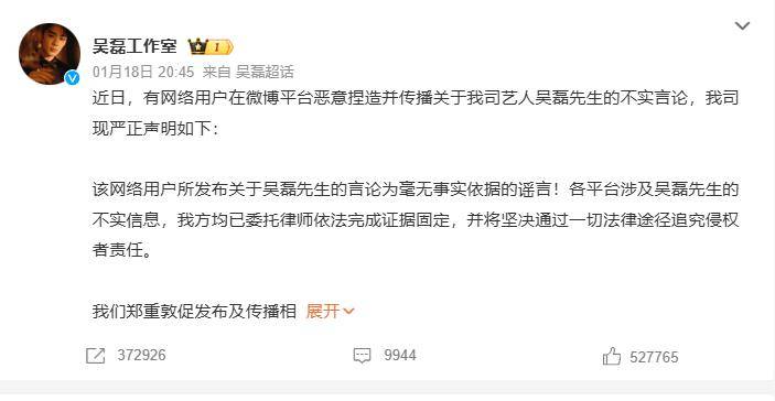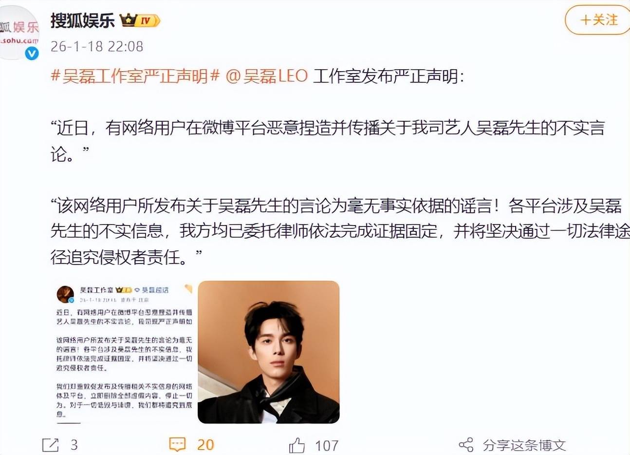 吴磊工作室的反应堪称雷霆速度。20:45,一份盖有公章的严正声明全网发布,距离爆料出现仅一小时零八分。声明中,工作室将相关言论定性为“毫无事实依据的恶意造谣”,并明确表示已完成全平台证据保全,委托律师事务所启动法律程序,坚决追究侵权者的法律责任。这份声明没有暧昧空间,不留协商余地,清晰传递出“零容忍”的态度。