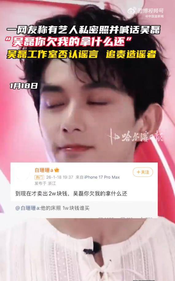 一则没有图片、没有录音、更没有聊天记录的指控,将演员吴磊推上了舆论风口。1月18日晚,微博用户“白珊珊a”连续发文,一句“吴磊你欠我的拿什么还”的质问,配上“床照售卖”的模糊暗示,瞬间点燃网络。然而,这场来势汹汹的“爆料”,从开始到被官方碾碎,仅用了68分钟。
