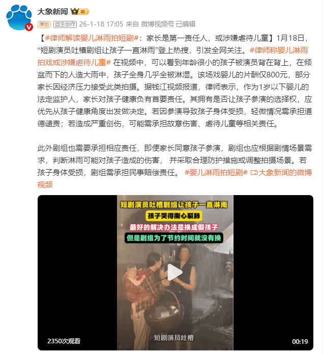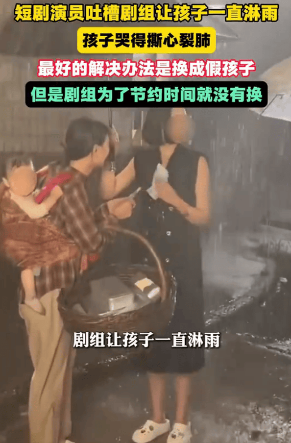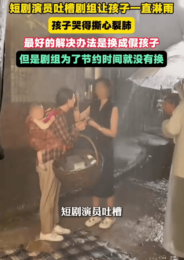 (来源:大象新闻)1月18日,“短剧演员吐槽剧组让孩子一直淋雨”登上热搜,引发全网关注。在视频中,可以看到年龄很小的孩子被演员背在背上,在倾盆而下的人造大雨中,孩子全身