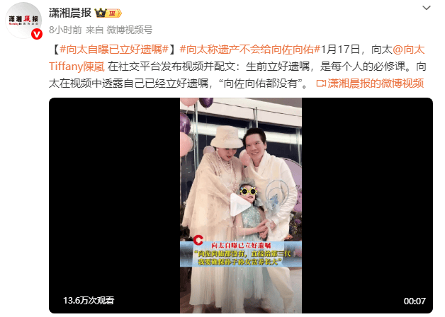 1月17日,向太在社交平台发布视频并配文:“生前立好遗嘱,是每个人的必修课。”向太在视频中透露自己已经立好遗嘱,“向佐向佑都没有,直接留给你们的下一代,我该给的都给了,就是你们要拍电影、要创业的,我都给了,我要确保我的第三代要富养的长大,孙子孙女都要富养,那我们就开心了。”