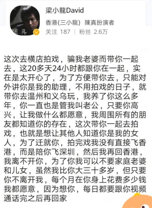 梁小龙的私人社交账号突然发出一张视频截图,配文承认“出轨”,并称为了哄骗年轻女性,撒谎云云,还说自己为了某个真爱,可以抛弃自己现在的家庭。