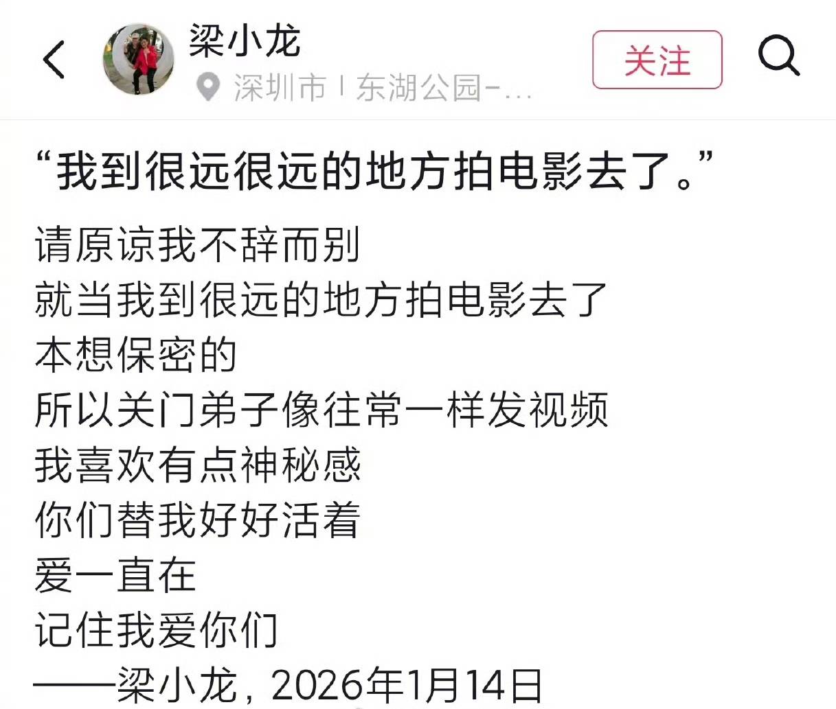 “梁小龙”写道:我到很远很远的地方拍电影去了。请原谅我的不辞而别。本想保密的,所以,关门弟子像往常一样发视频。