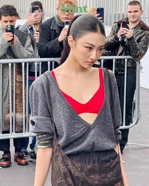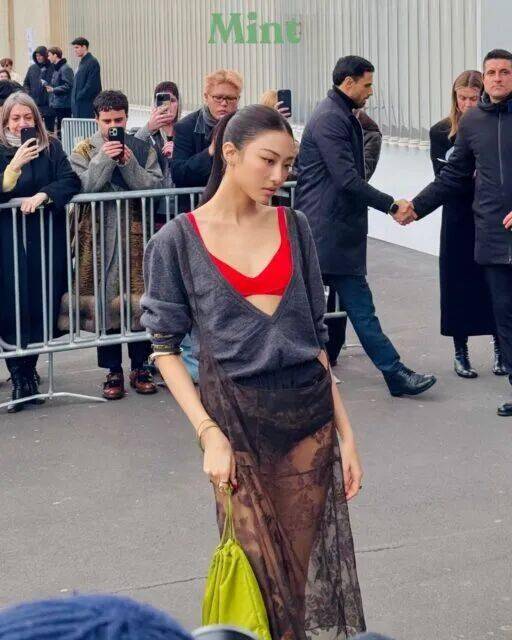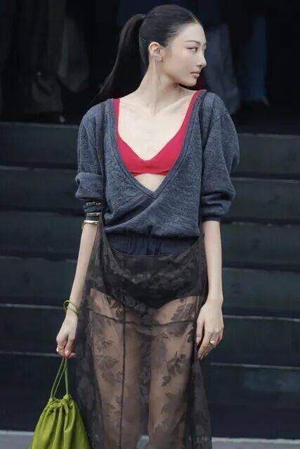 然而,1月18日PRADA秀场上的她,成为了争议的焦点。Gawon身着一套深灰色长袖上衣搭配蕾丝透视半裙的造型现身。上衣采用了大胆的深V剪裁,使得内搭的鲜红色胸衣完全显露,成为整体视觉的核心;下半身的透视蕾丝裙则内衬了安全短裤,在若隐若现中寻求平衡。