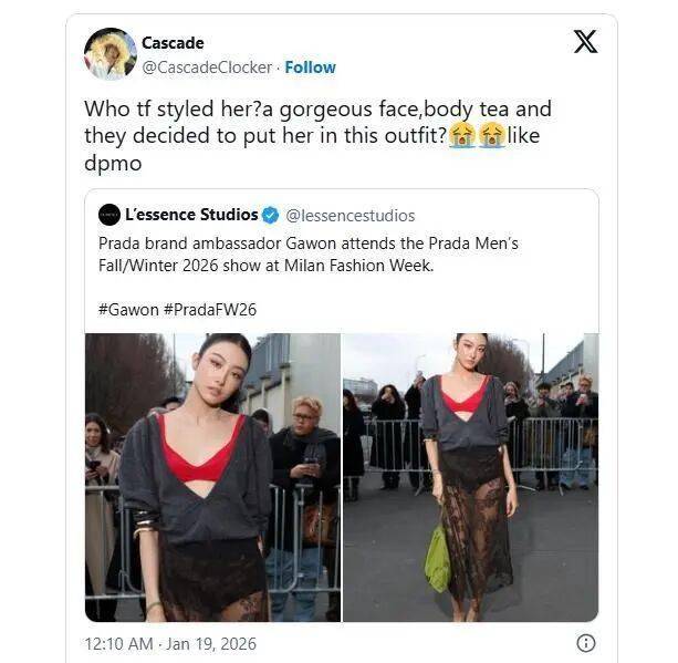 又一季国际时装周在巴黎拉开帷幕,这场时尚界的盛宴向来不缺话题。当红五代女团MEOVV成员Gawon,作为PRADA品牌大使亮相品牌大秀,却因一套极具争议的造型,在网上引爆了冰火两重天的讨论。