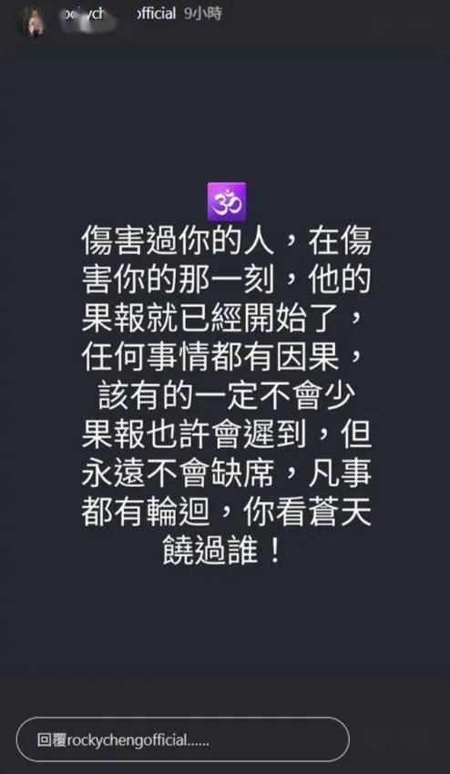 数天后他于昨天(17日)在社交网上载黑底白字图片回应。他写道︰伤害过你的人,在伤害你的那一刻,他的果报就已经开始了,任何事情都有因果,该有的一定不会少。果报也许会迟到,但永远不会缺席,凡事都有轮迴,你看苍天饶过谁!字里行间似乎暗示自己才是受害者。