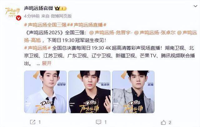随着三强名单的确定,《声鸣远扬》总决赛的战火正式点燃。危晋宇的跨界突破、张卓尔的摇滚底蕴、高旭的抒情功底,三位选手风格各异、各有优劣,冠军归属至今难有定论。从目前的口碑来看,危晋宇凭借唱跳舞台的惊喜表现圈粉无数,成为新晋夺冠热门;张卓尔虽状态下滑,但实力底子仍在,若能找回巅峰状态依旧具备竞争力;高旭则需打破“稳却平庸”的标签,用创新作品扭转口碑。