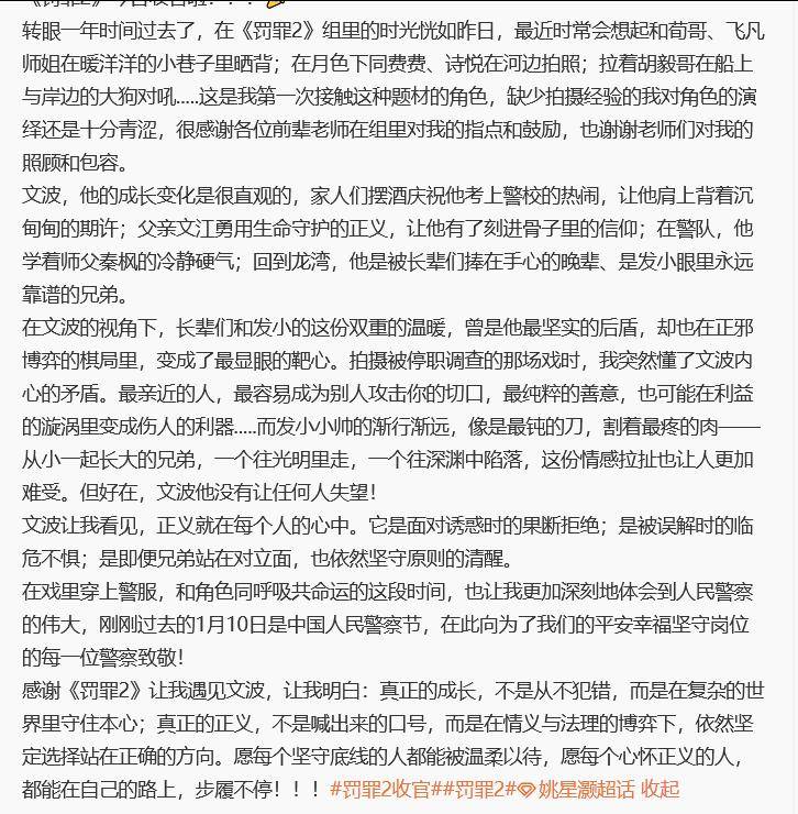 他在文中回忆拍摄趣事,有跟赵荀飞凡晒背,费费诗悦河边拍照,跟胡毅哥对着岸边大狗吼。文波这个角色的成长变化很直观,期许、信仰构成了他一定要当警察,后来成为秦枫的徒弟,成为博弈棋子里的靶心。