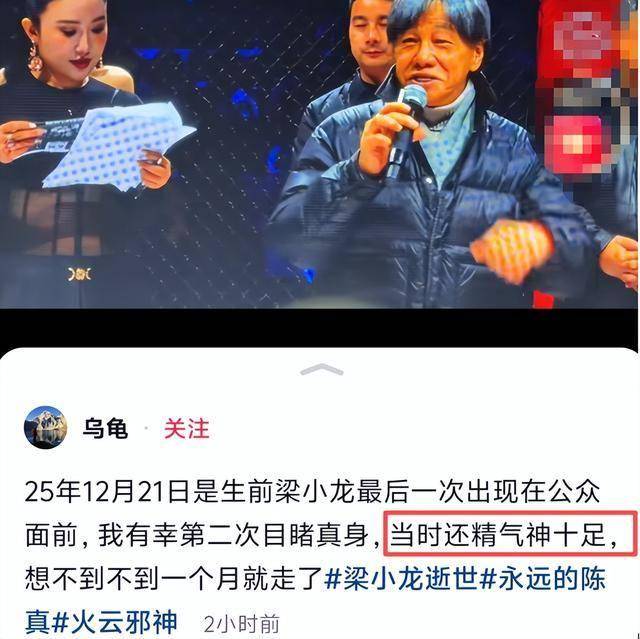 梁小龙于1月14日离世,引起了无数网友的震惊,两周前,他疑似还活跃在网上冲浪。当时有网友晒出他点赞自己评论的画面,受宠若惊,看起来他心态还很年轻,玩网也玩的熟练。还有网友曝出