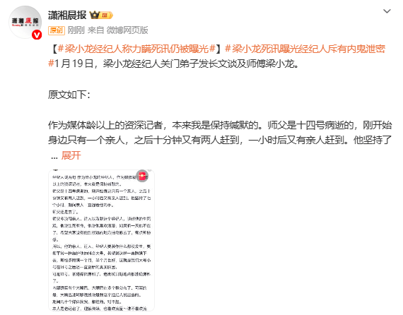 (来源:潇湘晨报)1月19日,梁小龙经纪人关门弟子发长文谈及师父梁小龙。原文如下:作为媒体龄以上的资深记者,本来我是保持缄默的。师父是十四号病逝的,刚开始身边只有一个亲人,之后十