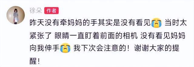 1月18日,徐朵特意在社交平台上回应争议,坦言当时因为太过紧张,根本没留意到要牵住妈妈的手,还俏皮表示下次一定会格外注意,不让大家再操心。