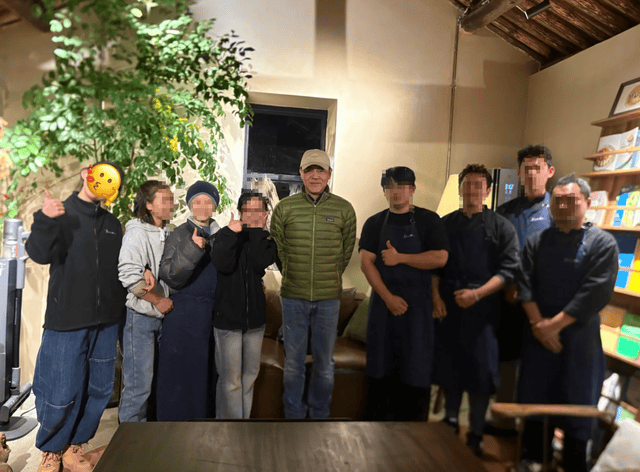 网友还晒出了与刘青云合照,照片中,与餐厅工作人员合影的刘青云站在C位,当日,他身着一件橄榄绿色的轻薄羽绒服搭配蓝色牛仔裤,头上戴着一顶浅卡其色棒球帽,与粉丝合影时的刘青云双手背在后面,嘴角微扬脸上挂满笑容,整个人看起来十分随和。
