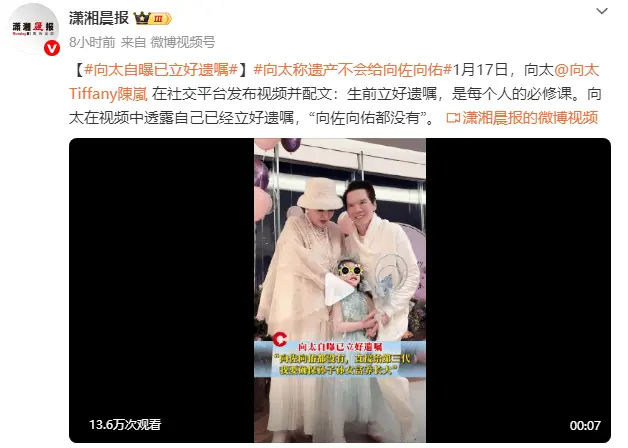 1月17日,向太在社交平台发布视频并称:“生前立好遗嘱,是每个人的必修课。”向太透露自己已经立好遗嘱,“向佐向佑都没有,直接留给你们的下一代,我该给的都给了,就