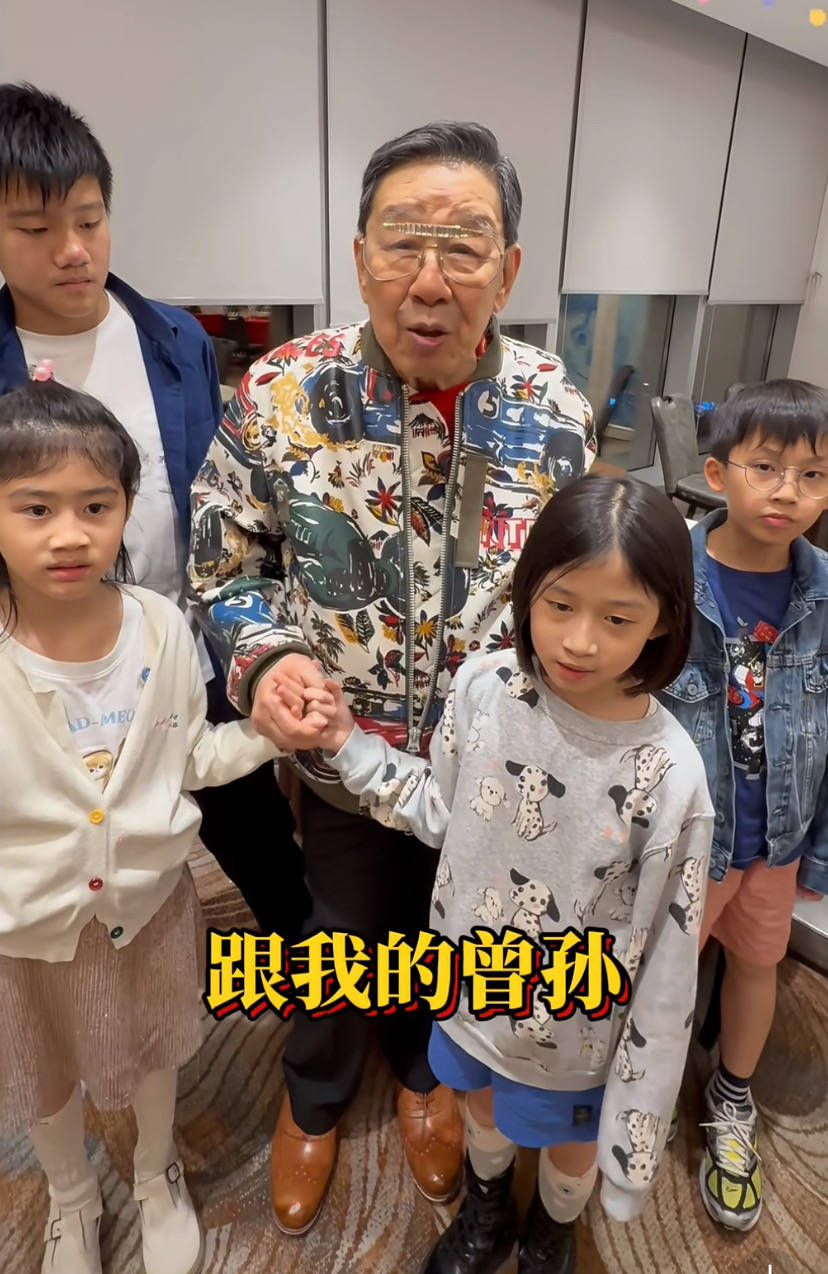 站在胡枫左手边的曾孙,应该已经12岁了、看着个子比胡枫都要高一头了。右侧的曾孙戴上了小眼镜,像个学霸。