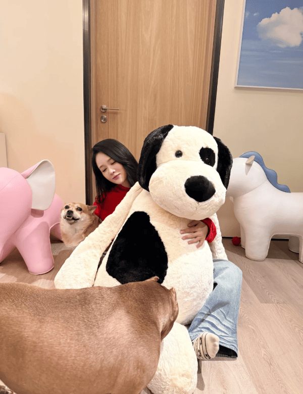 家中有很多的玩偶,包括坐凳,如果不是知道陈乔恩没有生孩子的话可能都会认为家里有小baby呢,看来陈乔恩的童心和少女心都好重啊!家中还养了三条狗狗,陈乔恩出来遛狗的时候穿着粉色兔子耳朵的毛毛鞋看起来好可爱。