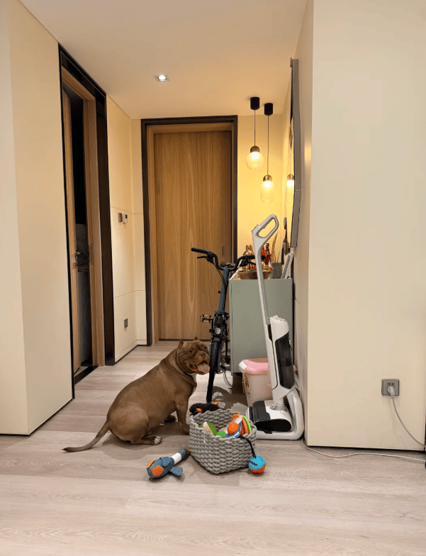 门口的鞋柜也不算大,偶尔骑的小车车都放进来了,可见应该就是个两室一厅的房子,家中有这么多狗狗,平时拖地要更勤快一些了。