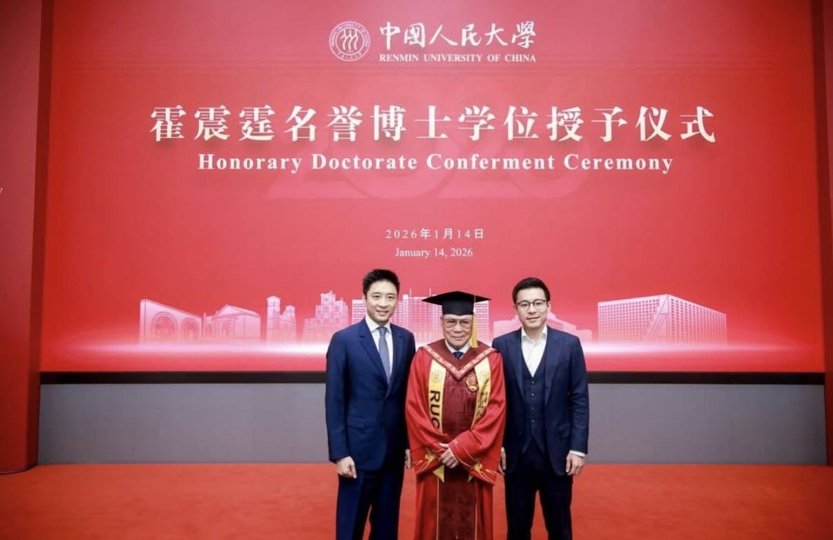 霍震霆被中国人民大学授予法学名誉博士学位,这称得是光宗耀祖的事情,也是霍家的大事,在被授予学位的那一天,理应全家前往观礼、见证。事实上在颁授当天,霍震霆本人以及其两个儿子霍启山、霍启仁就现身在了中国人民大学深圳研究学院前海园区。