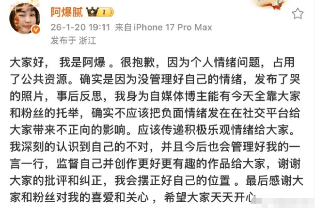 1月20日,多名网友发帖称,该账号已设为私密。20日晚间,“阿爆”发文道歉,称不该把负面情绪发在社交平台,应该传递积极乐观情绪给大家。