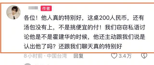 1月20号,有一位来自台湾省的网友分享了一段于餐馆吃饭的画面,并透露当天遇到了霍建华。
