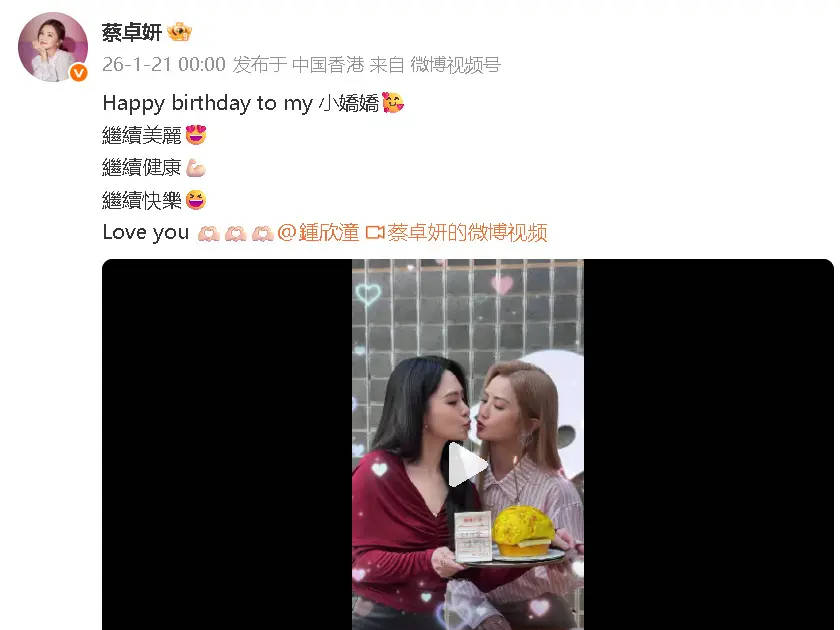 1月21日,钟欣潼过生日,蔡卓妍卡零点为她庆生:“Happy birthday to my 小娇娇”。她还晒出了二人的亲密合照。照片中,二人穿着休闲,彼此嘟嘴亲亲非常有爱。