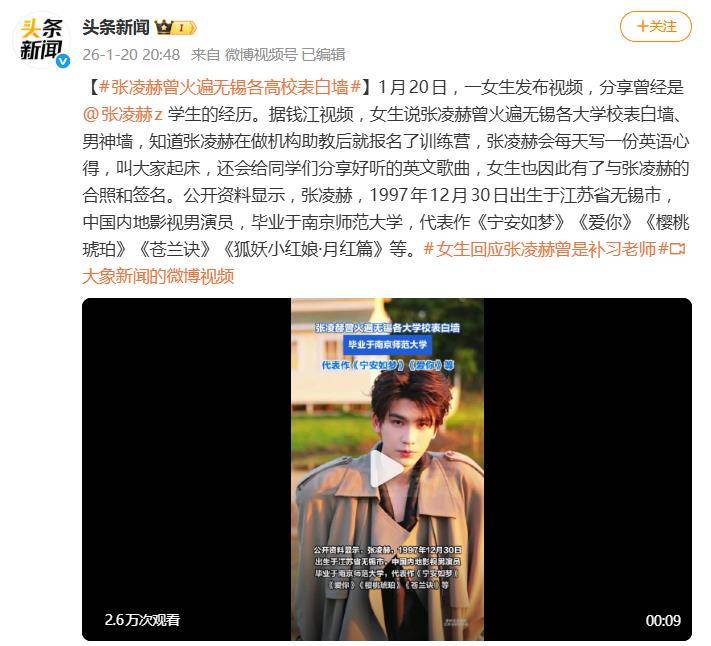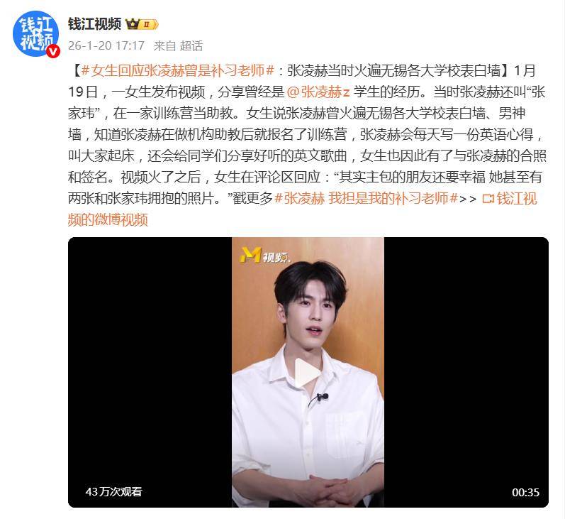 视频中,女生回忆道,当时张凌赫还使用本名“张家玮”,在无锡一家英语口语训练营担任助教班长。凭借出众的外形和优异的成绩,他频繁登上本地各大高校的“表白墙”和“男神墙”,成了不少学生慕名报名训练营的直接动力。这位女生就是其中之一,为了上他的课而专门报了名。