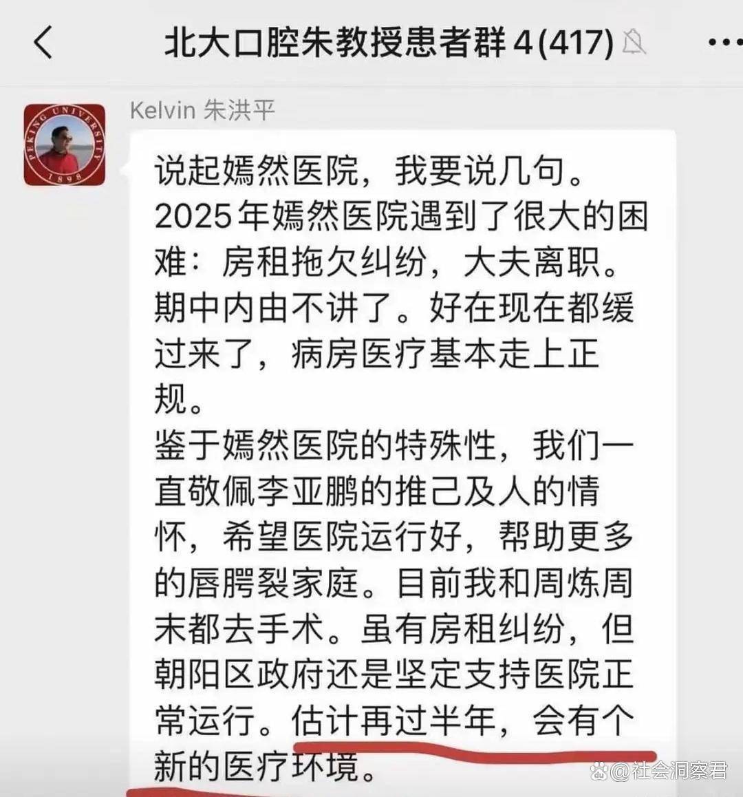 李亚鹏公益医院欠租事件,仍在持续发酵。近日,据网上流出北大口腔朱教授患者群4消息,朱洪平表示,说起嫣然医院,我要说几句。