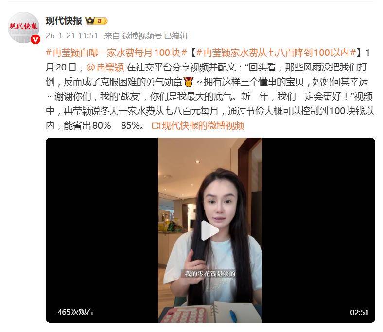 一则关于“每月水费从七八百降到一百块”的分享,让冉莹颖的名字再次冲上热搜。这次,无关时尚派对,也非明星八卦,而是实打实的“家庭省钱攻略”,在年关将近时戳中了不少人的神经。