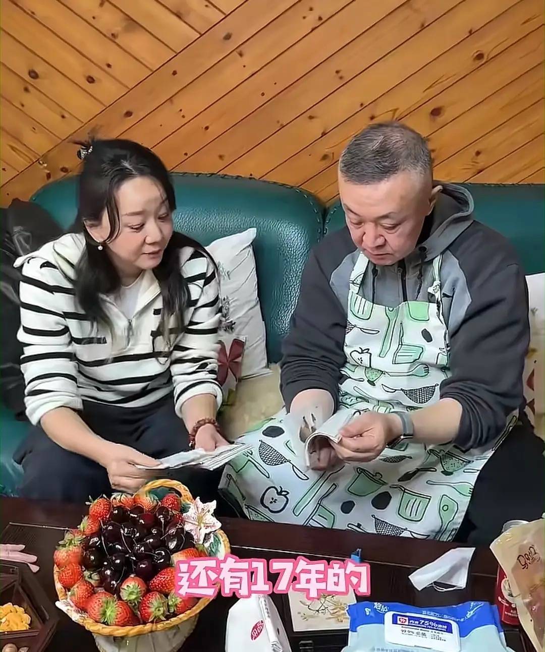 老朋友王一楠来了,夫妻俩出门迎接。马晓飞穿着连帽卫衣、还戴着围裙,挽着衣袖,一看就是正在厨房里忙活。