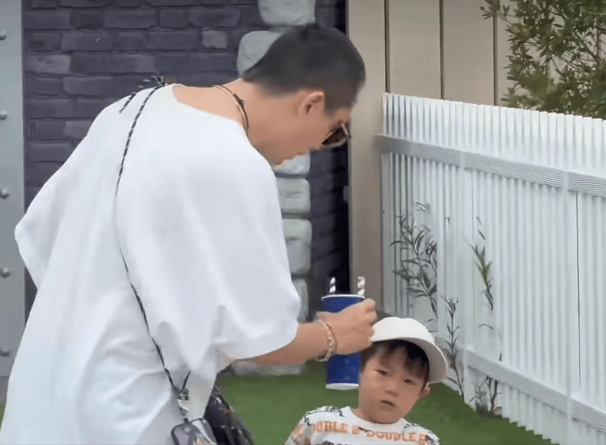 他坐在婴儿车上,李承铉在给他喂水。这个画面很温暖,李承铉私下里特别体贴、是个负责任的好爸爸、好丈夫。