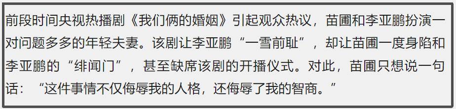 苗圃和李亚鹏曾合作过电视剧《我们的婚姻》,也是老朋友了。因为在剧里演情侣,还一度被传出过绯闻,搞得当时苗圃为了避嫌都没有出席开播仪式,事后被问起,苗圃回应称“这件事情不仅侮辱我的人格,还侮辱了我的智商”。