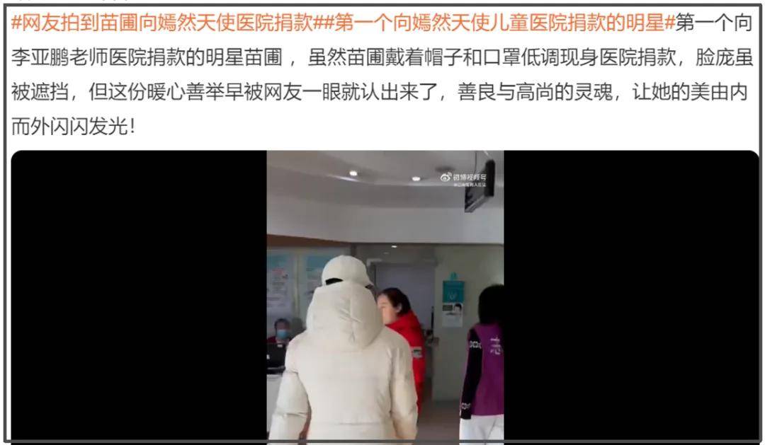 当天苗圃一身白色长款羽绒服,戴着黑色口罩独自去嫣然天使儿童医院现场捐款,身边没有人陪同,到场扫码捐完之后就匆匆离开。