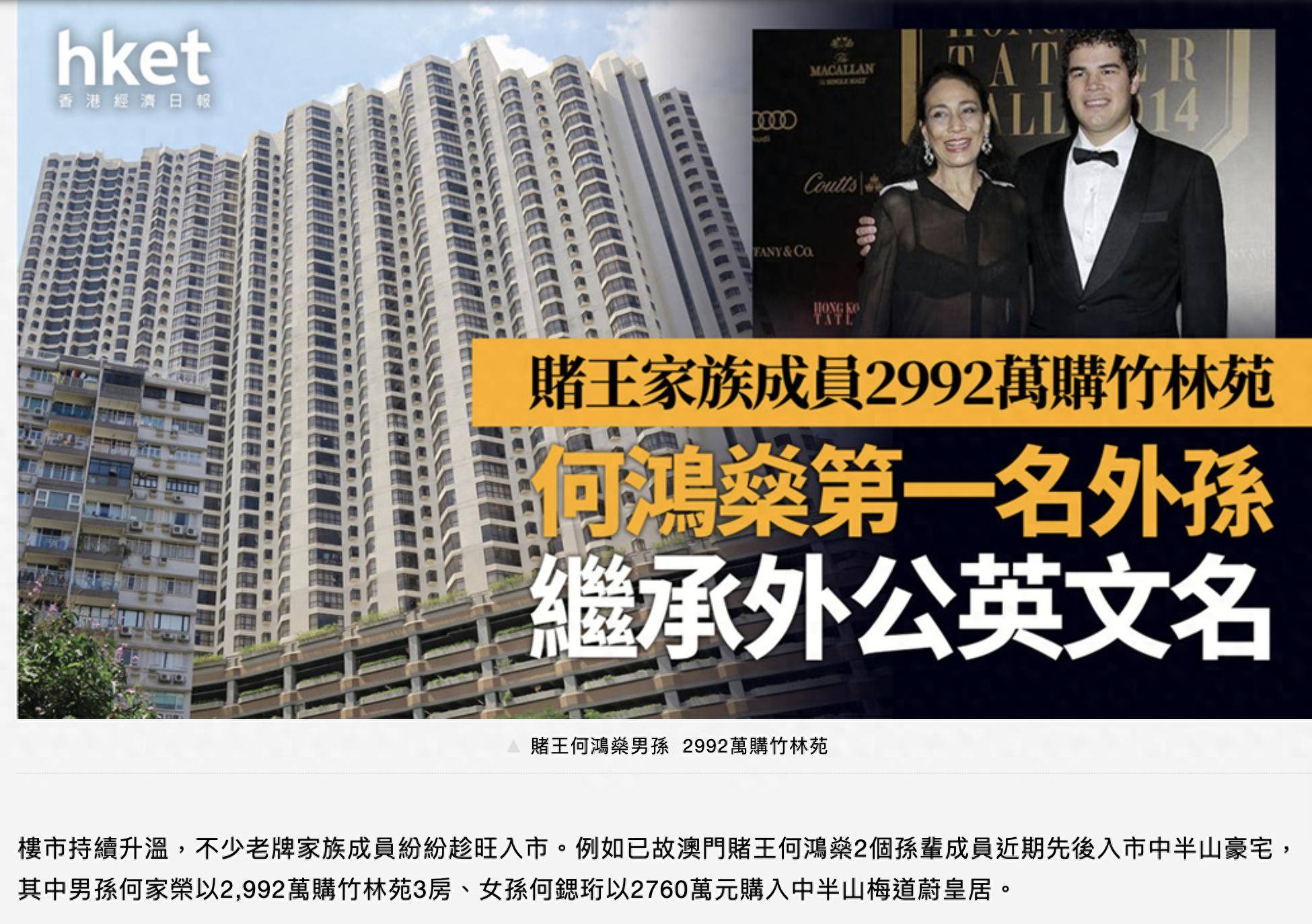 何鸿燊家族第三代成员近一个月来楼市的动作频频,继二房30岁外孙女何锶珩被曝光以公司名义在香港以2760万买了一套豪宅之后,这些年已经绝迹在社交场上的大房成员也被曝光在香