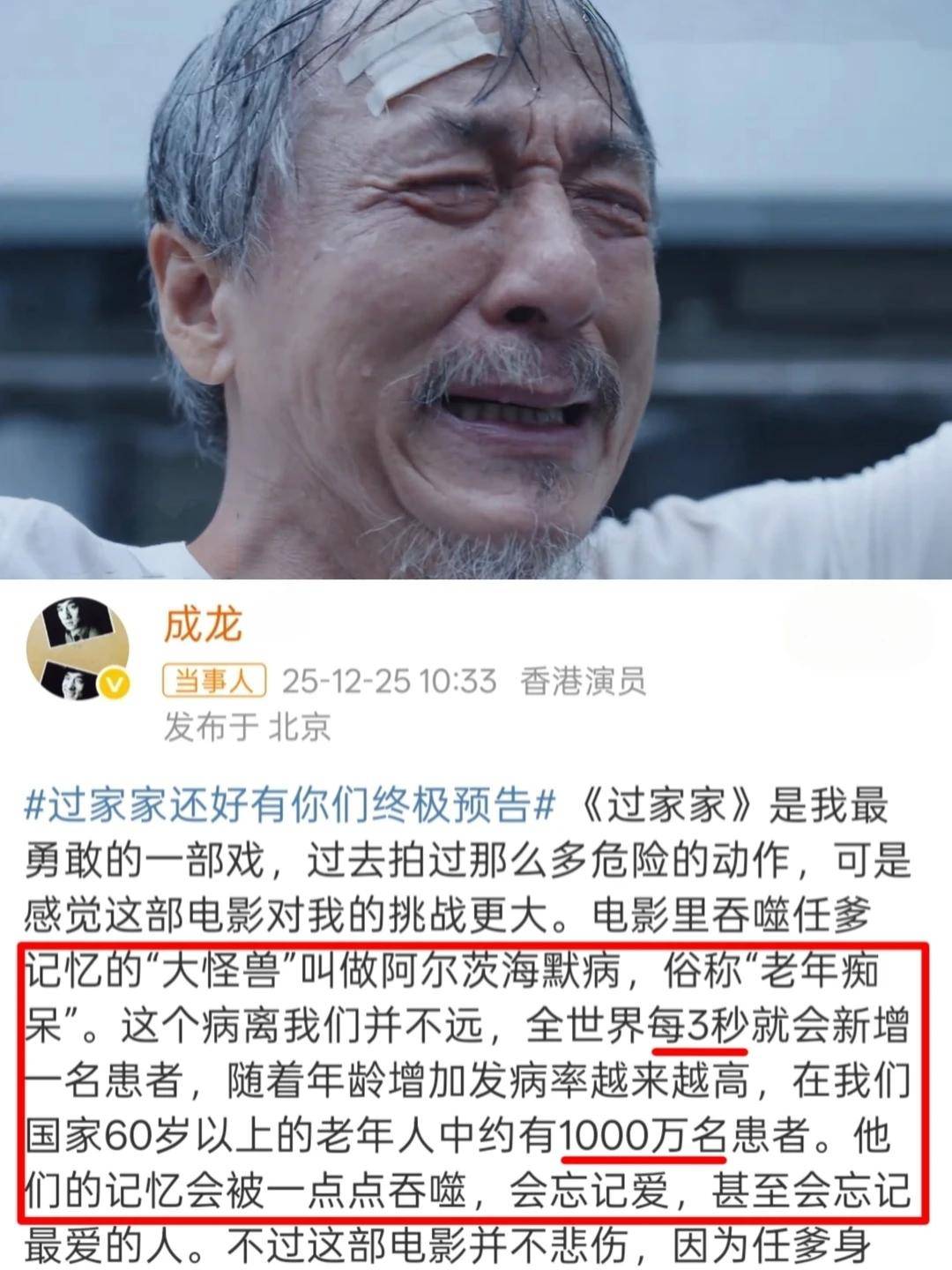 镜头下的成龙完全没有巨星包袱,把“父辈式”神态演绎得淋漓尽致。