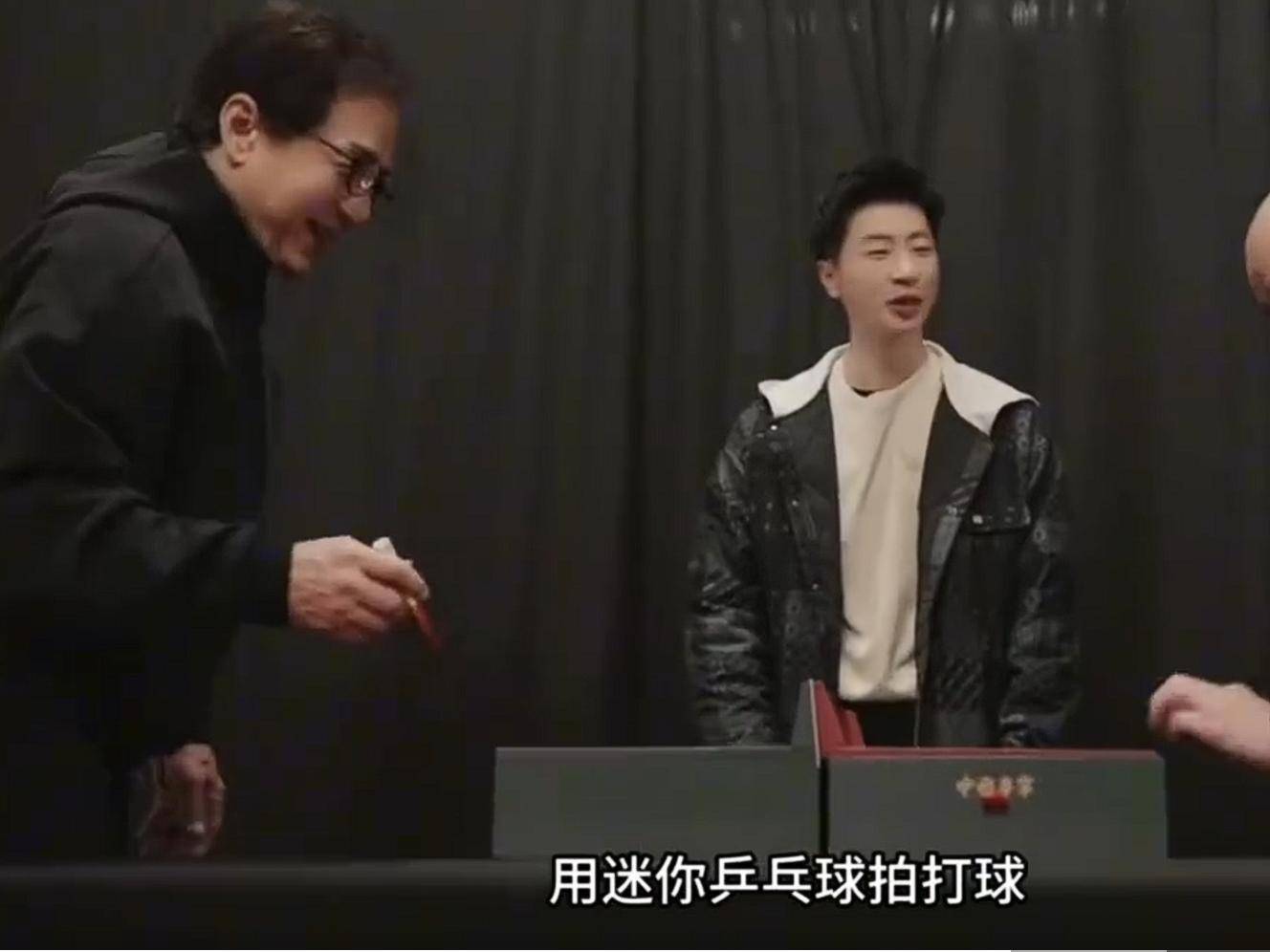 工作人员架起迷你乒乓球台,马龙拿起球拍邀请切磋,成龙连忙往后退了半步摆手推辞,嘴里念叨着“不好打不好打,我这可是业余中的业余”。