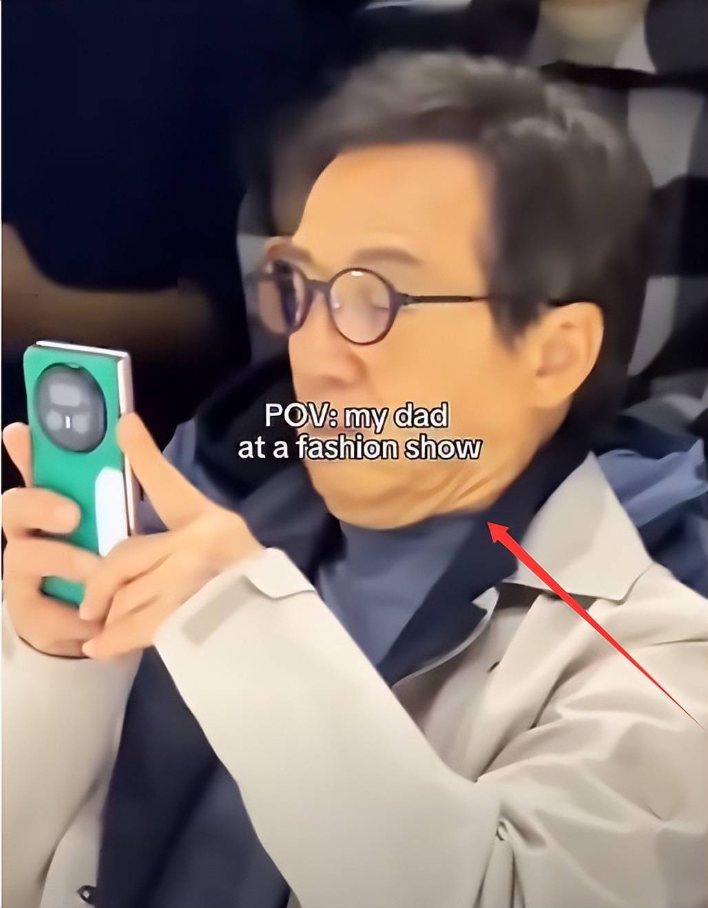 他一会儿皱着眉头紧盯T台设计细节,像是在研究什么新奇物件,一会儿又左右张望、偶尔嘟嘴沉思,眼神里透着几分迷茫,愁得下巴上都挤出了三层褶子。