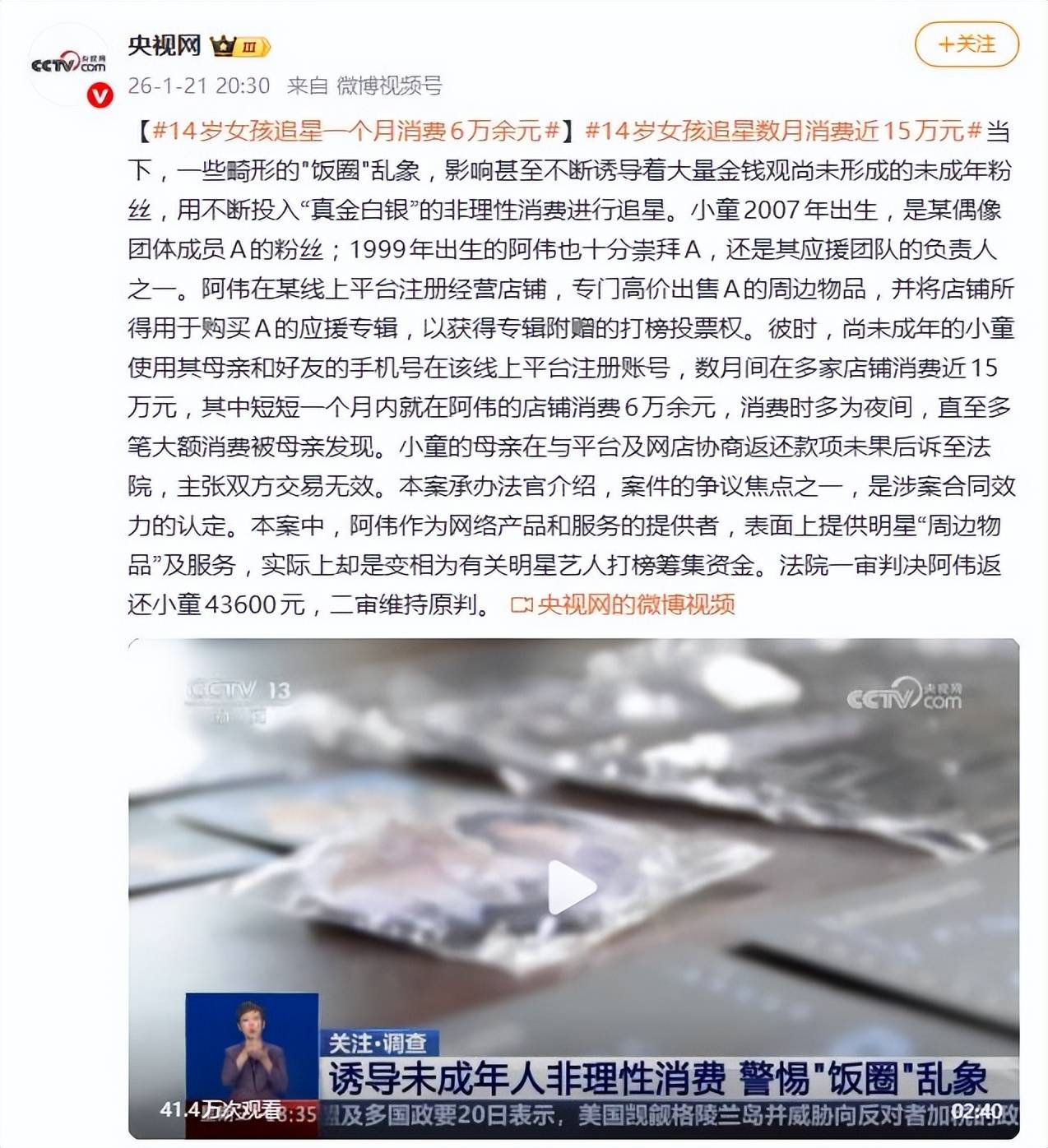 据1月21日晚间报道,一则“14岁女孩追星数月消费近15万元”的法院判例,再次将畸形的“饭圈”消费链拽到了公众眼前。这场未成年人与“粉头”之间的巨额交易,不仅让家长血压飙升,更揭开了狂热追星背后那套隐秘的“资金收割术”。