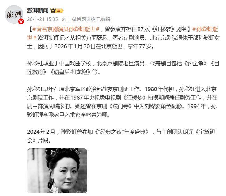 据1月21日报道,1月20日凌晨,一则消息让无数“红楼迷”心头一沉。著名京剧演员、87版电视剧《红楼梦》中“周瑞家的”扮演者孙彩虹,因病在京逝世,享年77岁