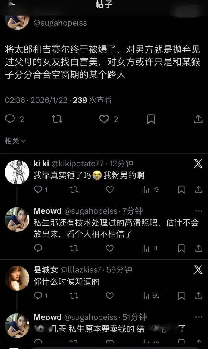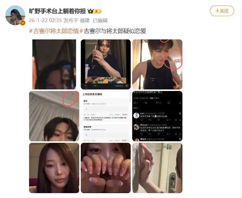 据网络流传信息,事件的起点是2025年9月吉赛尔在某海外签售会(网传地点为上海或纽约)期间,被粉丝拍到正与一名男性进行视频通话。随后流出的截图被指通话另一方正是将太郎。支持此说的网友展开了一系列“细节侦查”:从将太郎的美甲款式,到其队友同期直播中出现的酒店背景墙与截图内景高度吻合,再到两人那段时间频繁出现的同色系(褐色)服装,都被视为“暗戳戳”的关联证据。爆料者称,这张截图最初在私生圈以高价流通却未激起水花,直至流入豆瓣等社群才彻底发酵。