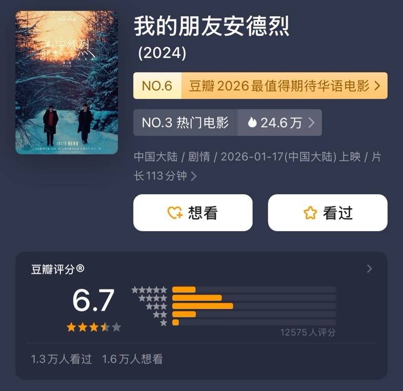 然而,上映5天,《我的朋友安德烈》仅收893万票房,票务平台预测内地总票房为1863.4万。在豆瓣上,这部电影也仅有6.7分,算不上口碑佳作。