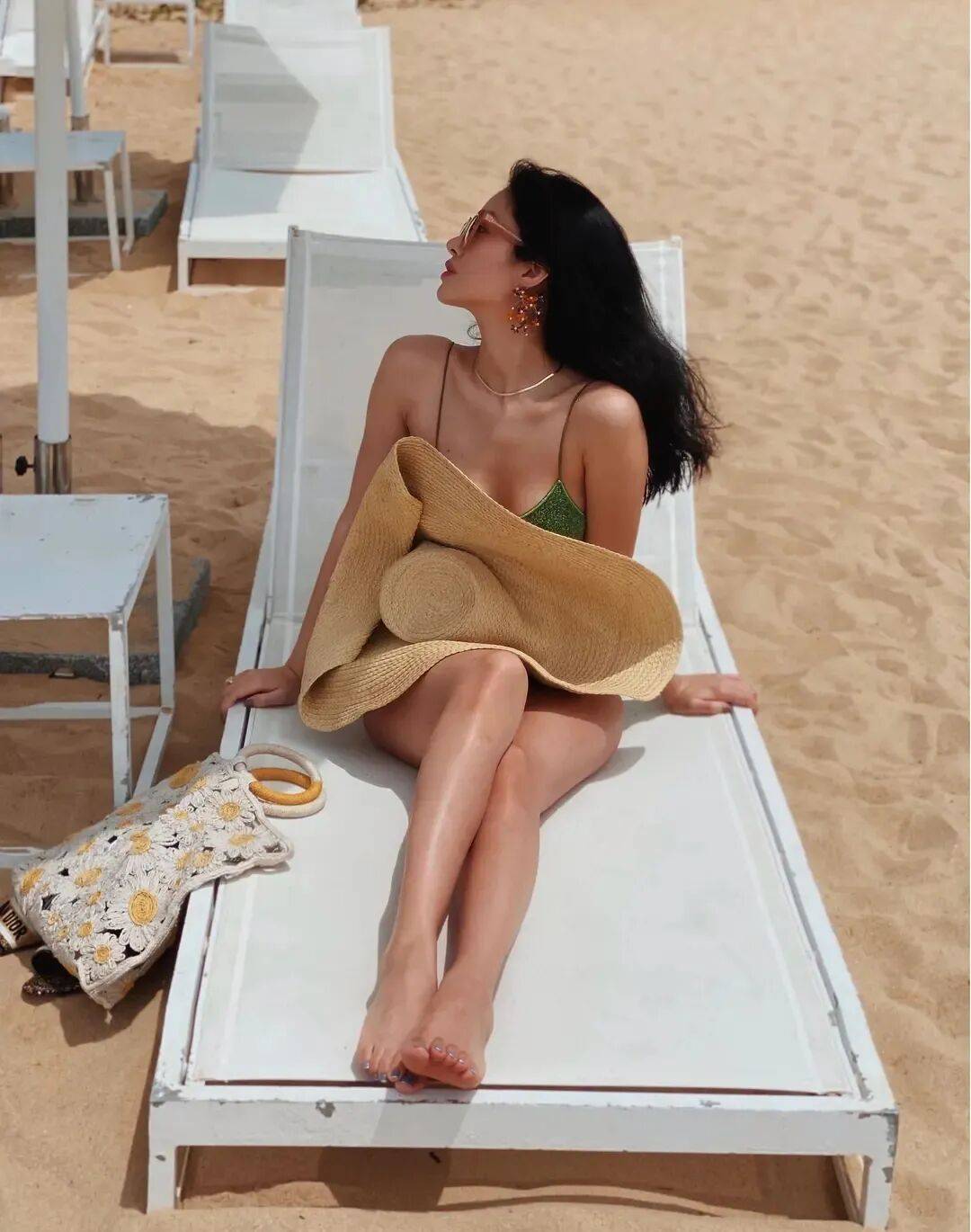 杨采钰穿着绿色比基尼泳装,她戴着墨镜,坐在沙滩边的躺椅上,歪着脑袋遥远方,露出自己的香肩和事业线,大美腿修长,绝对性感火辣!