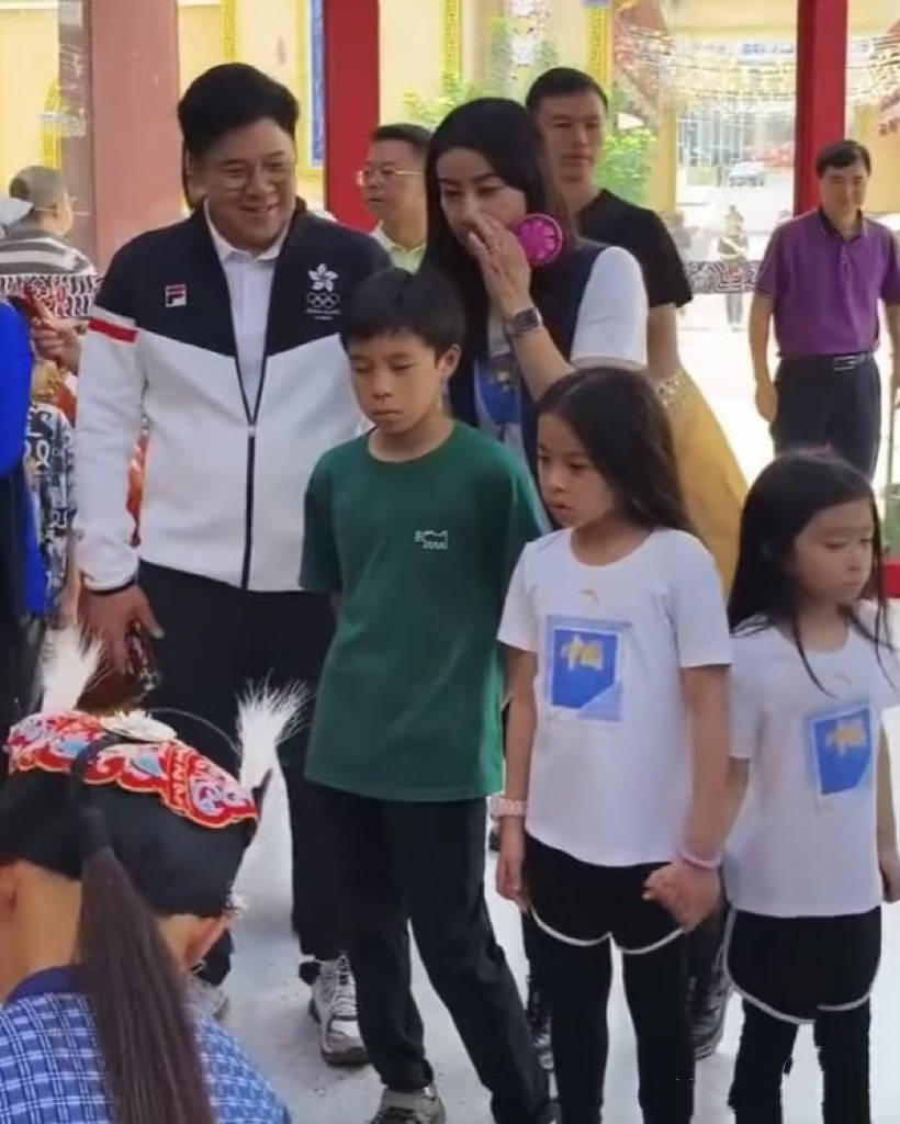 霍中曦已经12岁了,是典型的学霸、也很懂孝道,长得更像太爷爷霍英东,家人对他寄予厚望。霍中妍和霍中怡长得更像妈妈,俏皮可爱,一家五口令人羡慕。