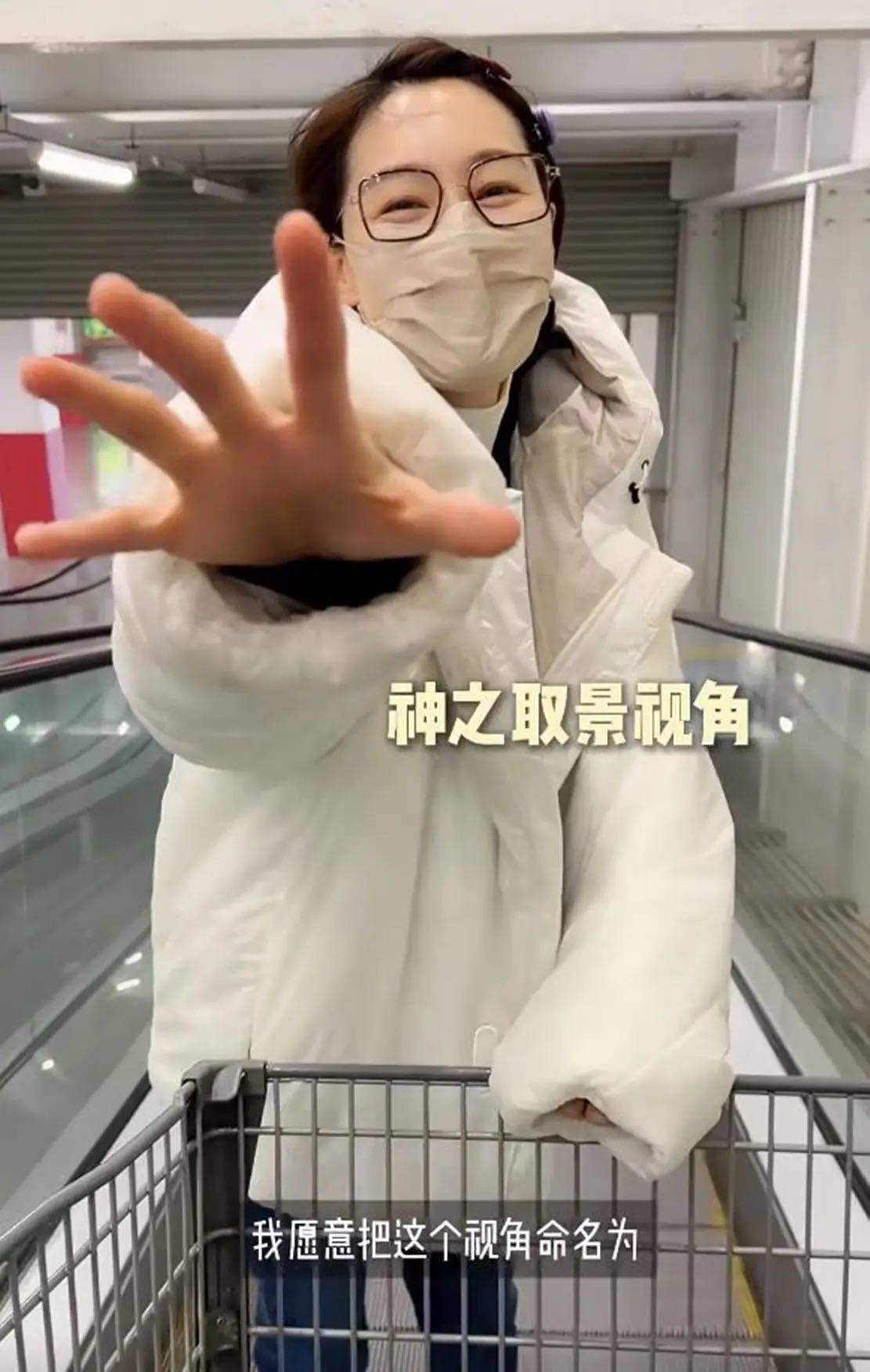 她穿了一件白色羽绒服,在老公前面蹦蹦跳跳的,老公就在身后给她拍照。她说老公的视角下,自己很像文艺女神。