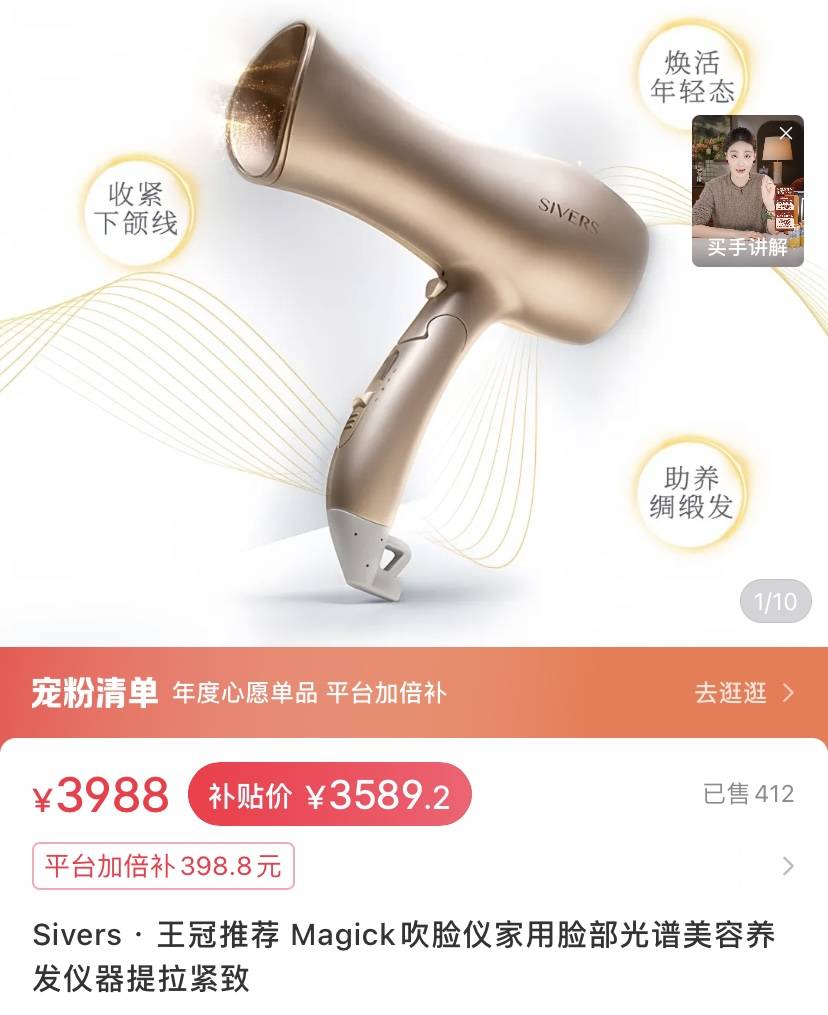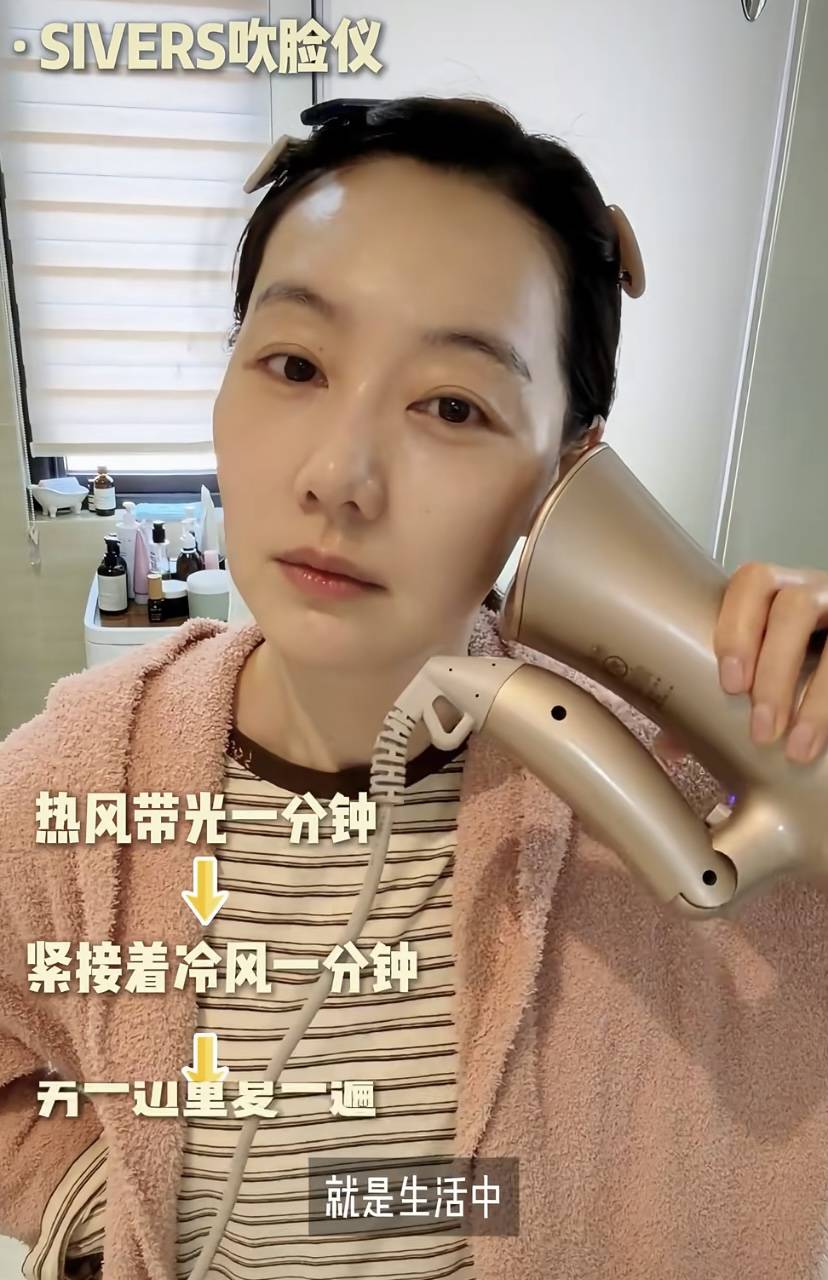 精华油面霜都依次涂抹之后,王冠还用吹脸仪来促进皮肤的吸收。