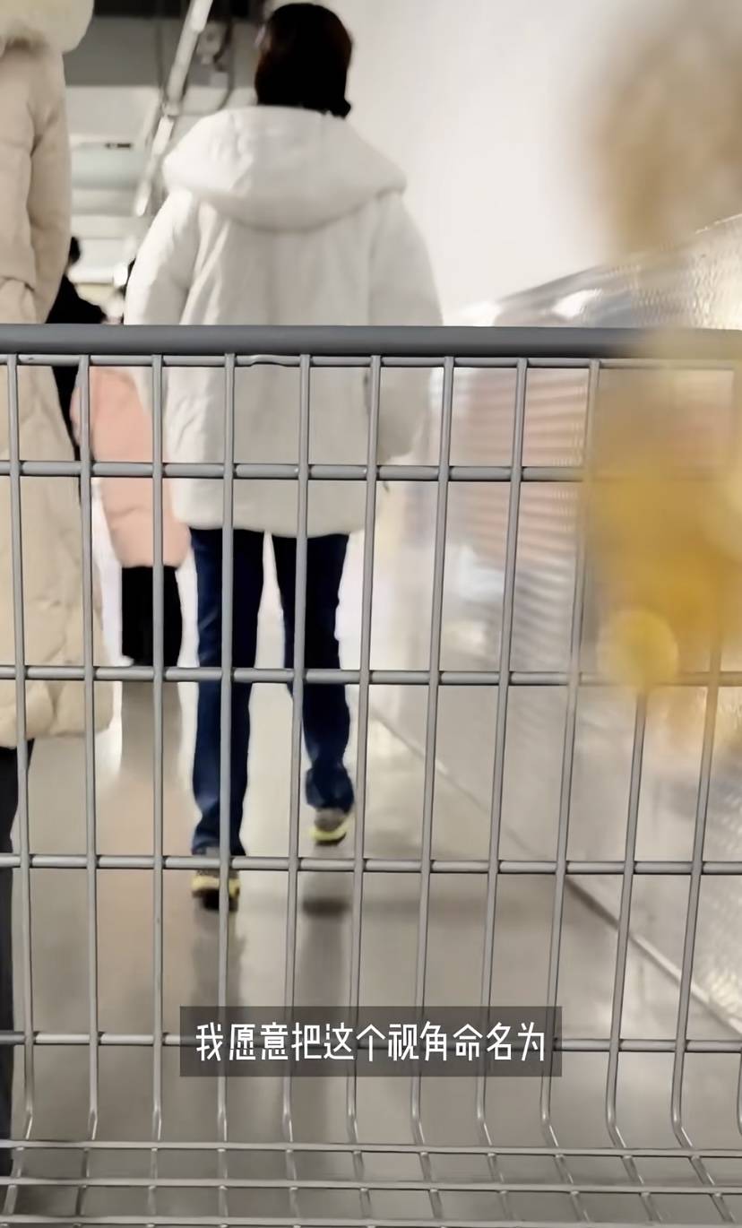 老公在后面推着购物车,王冠走在前面双手插兜,白色羽绒服、深蓝色牛仔裤、双手插兜,这个背影确实挺文艺的,很有意境。