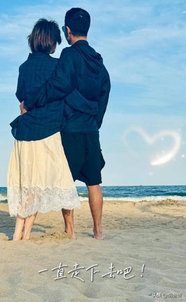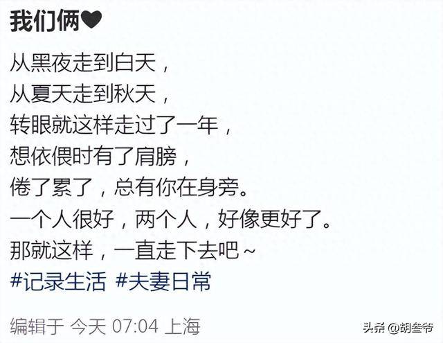 她写道:“我们俩,从黑夜走到白天,从夏天走到秋天,转眼就这样走过了一年,想依偎时有了肩膀,倦了累了,总有你在身旁。一个人很好,两个人,好像更好了。那就这样,一直走下去吧~”